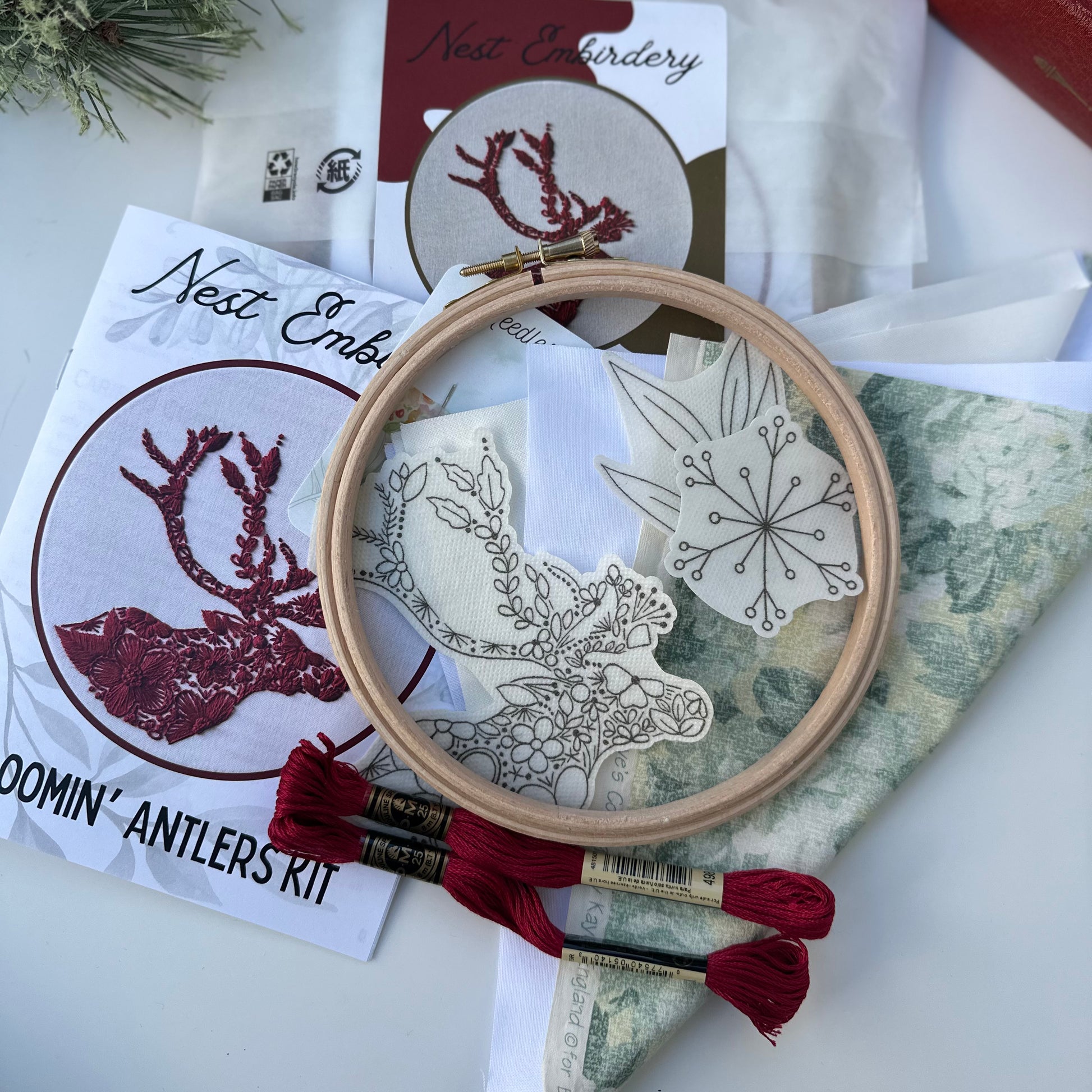 The Caribou is an iconic winter animal. This kit celebrates the beauty of these creatures and the elegance of winter alongside. This embroidery kit embraces festive colours and brings florals to a naturally barren time of year (depending on where you live!) This kit makes a 6-inch embroidered piece.